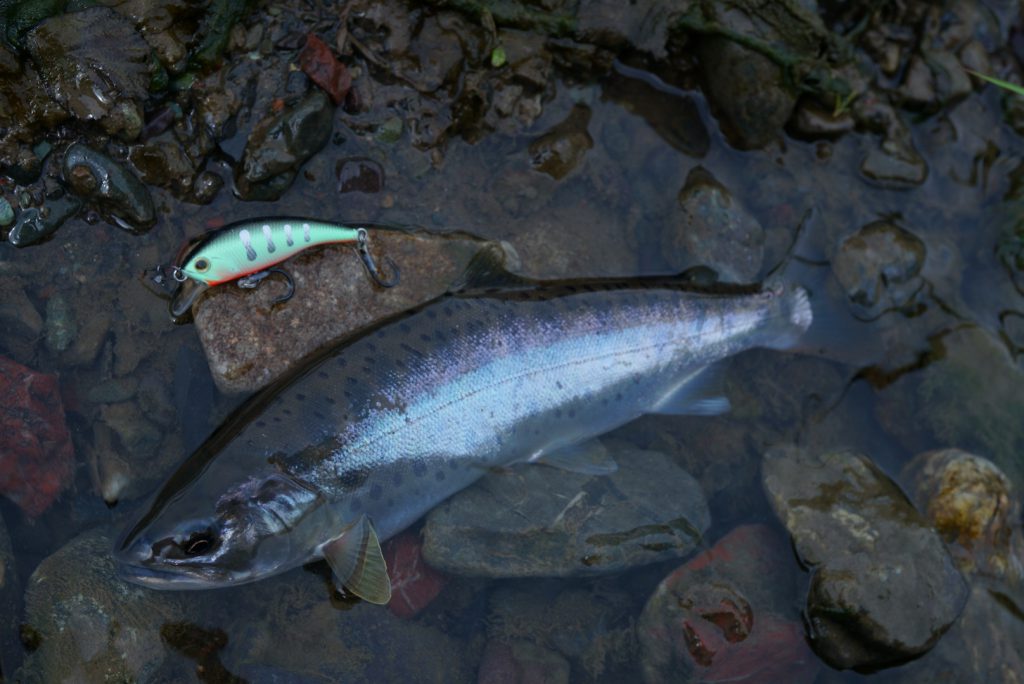 ダリア45Sをストラクチャーに沿わせるようにリトリーブするとヤマメがヒット。